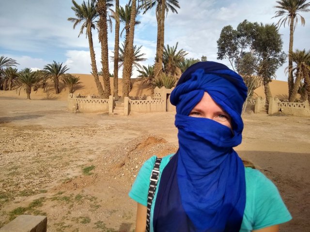 The second day a new guide joined our group to take us through a Berber village, and he talked so much we missed the silence of the driver. Despite talking for four hours straight, he didn’t impart any cultural information or history. He pointed out a crumbling ruin and told me it was abandoned, he walked us down an alleyway and told us it was old, he pointed out green dates on a tree and told us they weren’t ripe, and he pointed at a paved road and told us that it was possible to drive on it. The rest of the time he tried to tell jokes and then repeated them and explained them until the group would laugh. It was painful. The tour group was really friendly though. We had two Canadians, thirteen Germans, and us. One new friend even taught me how to tie a turban.