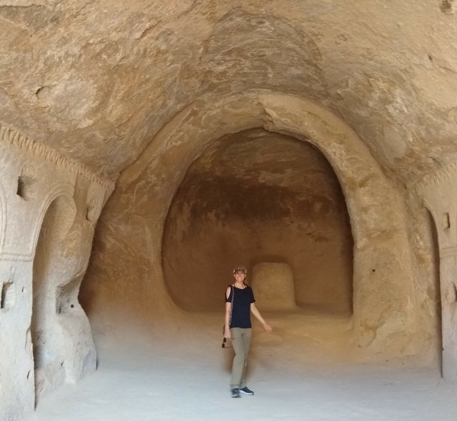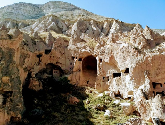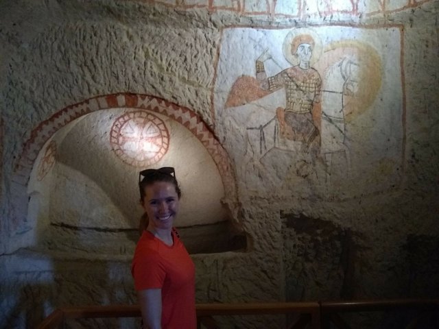 I explored the underground city of Kaymakli by myself. It was the coolest thing ever but it made me feel intensely claustrophobic. I could stand upright in many of the rooms, but the passageways were 4.5 feet tall and barely wider than my shoulders. There was a standard corridor with arrows to follow, but the siderooms weren’t roped off so I assumed they were meant to be explored. Some of these were then connected by further passageways and staircases to other rooms. I had to keep my bearings for fear of getting lost deep within the mountain. Archaeologists believe they have excavated 5% of the original city which may have housed 700 people. It is eight floors deep and the first four floors are open to the public.