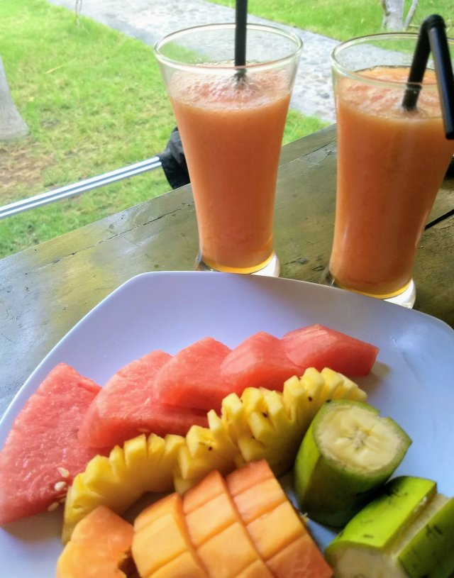 The fruit here is amazing. Most of the food is bland, but the fresh fruit tries to make up for it by being perfectly ripe and abundantly flavorful. Smoothies, fruit bowls, Radlers and fruity crepes with toasted coconut on top of everything: rice, bread, curry, other fruit. Our fruit intake was a bit low in Nepal so we are catching up now.