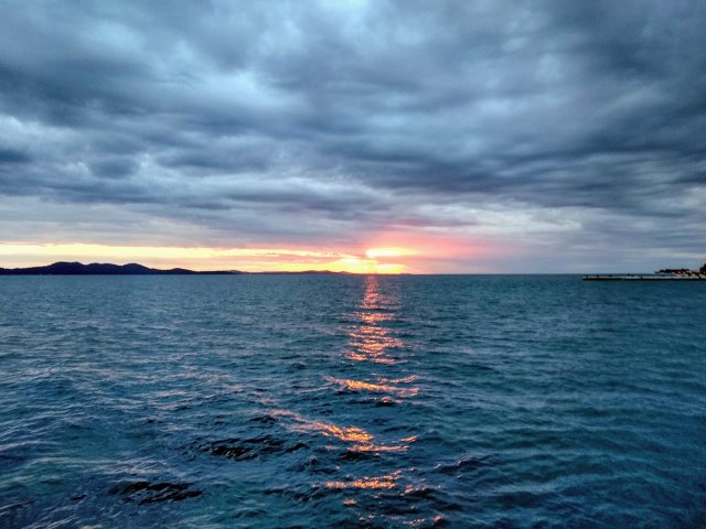 That pretty much summarizes our 12-hour bus ride from Sarajevo to Zadar. This wasn’t honking, it was an internal sensor that made ear-splitting noises intermittently the entire drive. I looked for a pattern to make sense of it so that the mystery would not drive me crazier than the noise. Sometimes it would beep for thirty seconds, sometimes for two. At most we would get five minutes between beeps, but most frequently it was only fifteen seconds of rest. We got to Zadar severely dehydrated with terrible headaches. We checked into our Airbnb, rehydrated, then mustered energy to go out and watch the sunset. With rain in the forecast, we wanted to enjoy the clear evening.