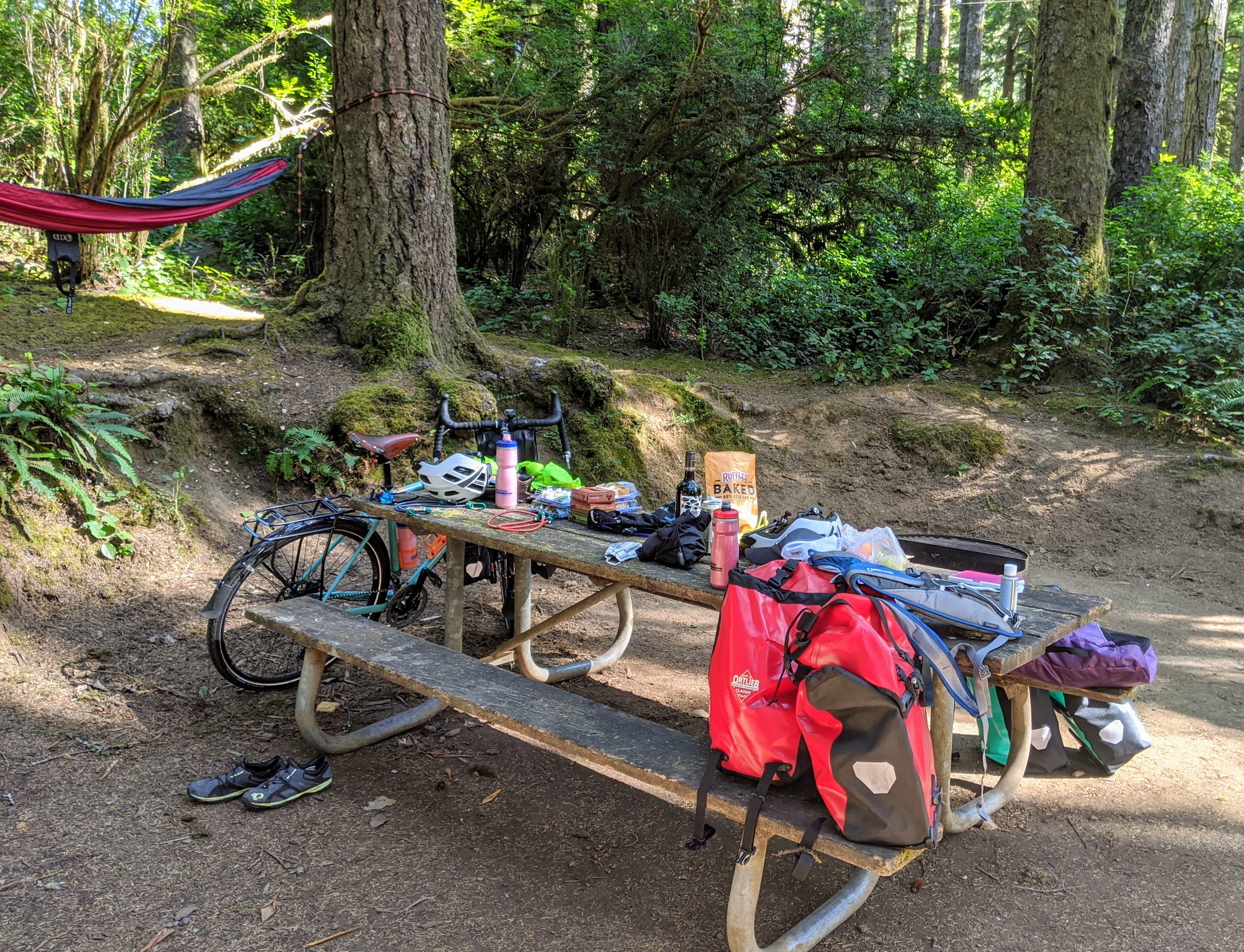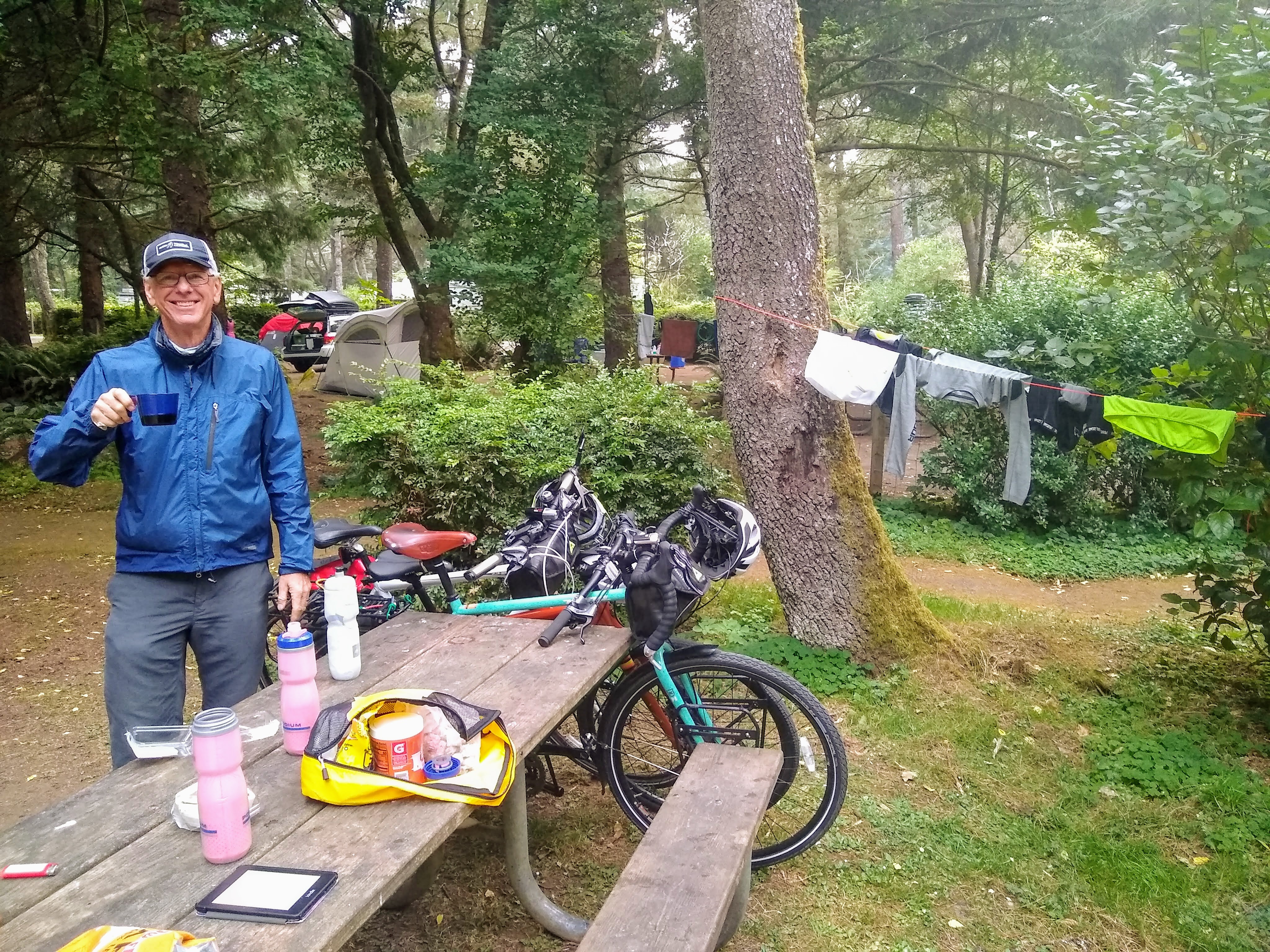 Due to Covid, half of the bathrooms and all of the showers were closed at the parks. For some reason I thought I would just dip in the ocean after a day’s ride, but it was cold in the evenings and I didn’t want to mess with salt water and sand. I managed to wash my hair twice when I found a sink with hot water, and we rinsed our clothes out a few times. I brought baby wipes and washed my dirt tan and chain grease off each evening. One evening I couldn’t scrub the dirt off until I realized that those were bruises covering my legs. I had fallen off my bike that morning when I forgot to unclip from my pedals.