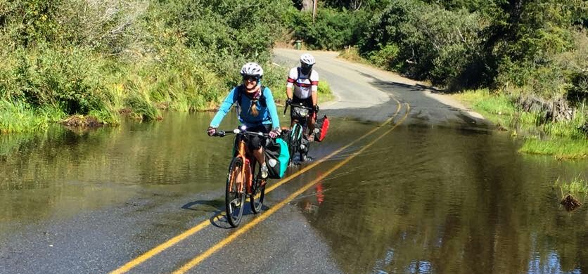 On Seven Devils, we felt a single drop of rain from the dark gray sky. We brought rain gear, but we really hoped to avoid needing it. An hour later the sky was clear and blue. It was a really fun section of road to ride. Rolling hills and big sweeping turns are pretty perfect biking conditions My dad was the first to the top of every single hill and Aaron raced to the bottom. We noticed a weird sign that said ‘High Water Line.’ I didn’t know what that meant as we were near the top of a hill and it seemed like flooding would ever reach that level. It became clear on the following downhill stretch when we came to an abrupt stop before the flooded road. We eyeballed the depth and picked the shallowest crossing where it was only two inches and wouldn’t reach our pedals.